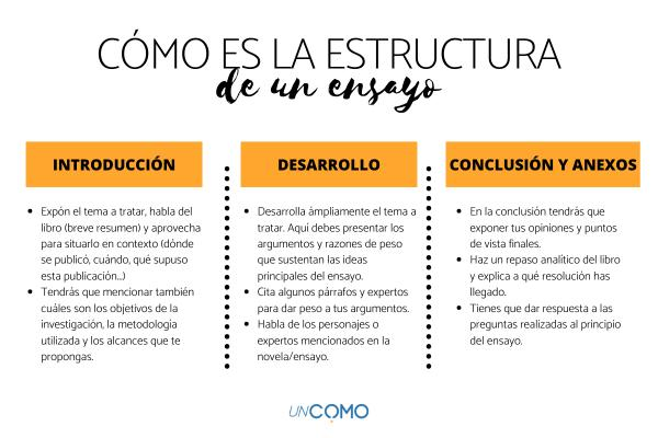 Un ensayo consta de tres partes fundamentales: introducción, cuerpo o nudo y conclusión. La introducción consiste en indicar al lector el propósito de la investigación, el tema y la organización que tendrá el texto. El cuerpo es el desarrollo de los puntos que se señalaron durante la introducción. La organización del mismo dependerá de las estrategias de argumentación que escojas. En la conclusión, se debe repasar brevemente las ideas que se presentaron en las dos partes anteriores y proporcionar una visión personal del autor sobre el tema expuesto.